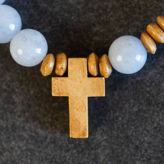 Aquamarine and Wood Stretch Cross Bracelet