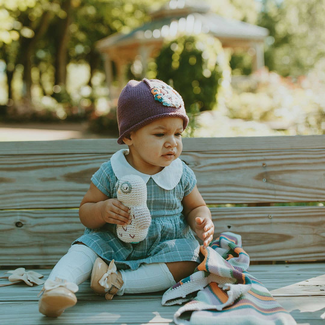 Hand-stitched in Bangladesh with buttery soft 100% organic cotton yarn, this plush toy owl is as sweet and gentle as a lullaby. The rattle inside makes a soft sound when shaken. This heirloom baby toy is sure to put smiles on faces for years to come. Machine wash warm on delicate setting. Measurements: 6"x3"x3"